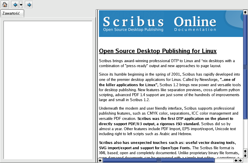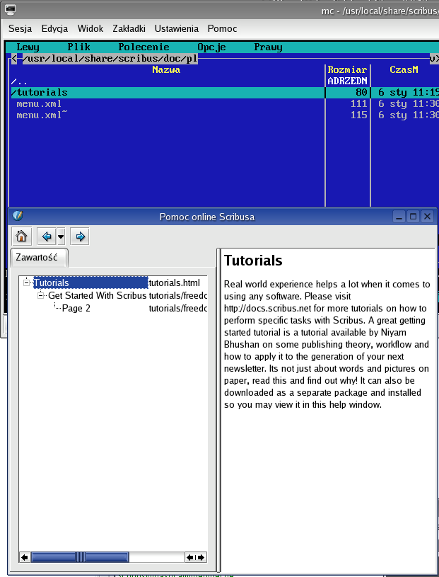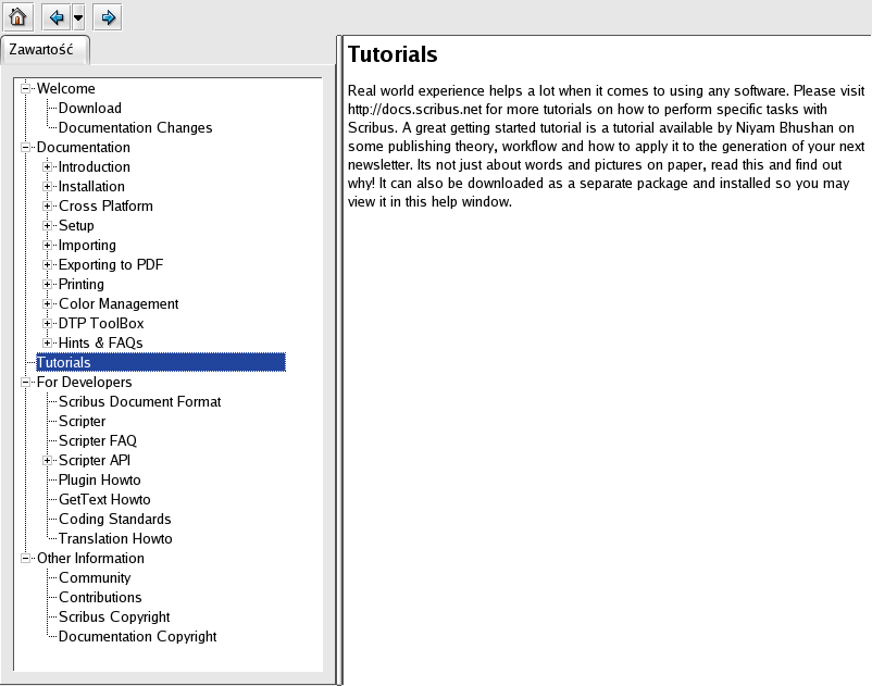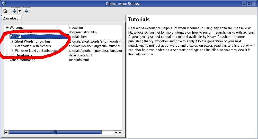 Have done the same as you ("scribus -pl" and "scribus -l en"), but with no satisfactory results. The attached pl.tar.bz2 contains a simplified version of $prefix/share/scribus/doc/pl/* - as you can see, there is a menu.xml and there are correct relative links in it, and I edited scribustutorial1.html, too. Could you install it, launch "scribus -l pl" and see, what you'll get - I've got help_browser5_PL_with_wrong_contents.png |