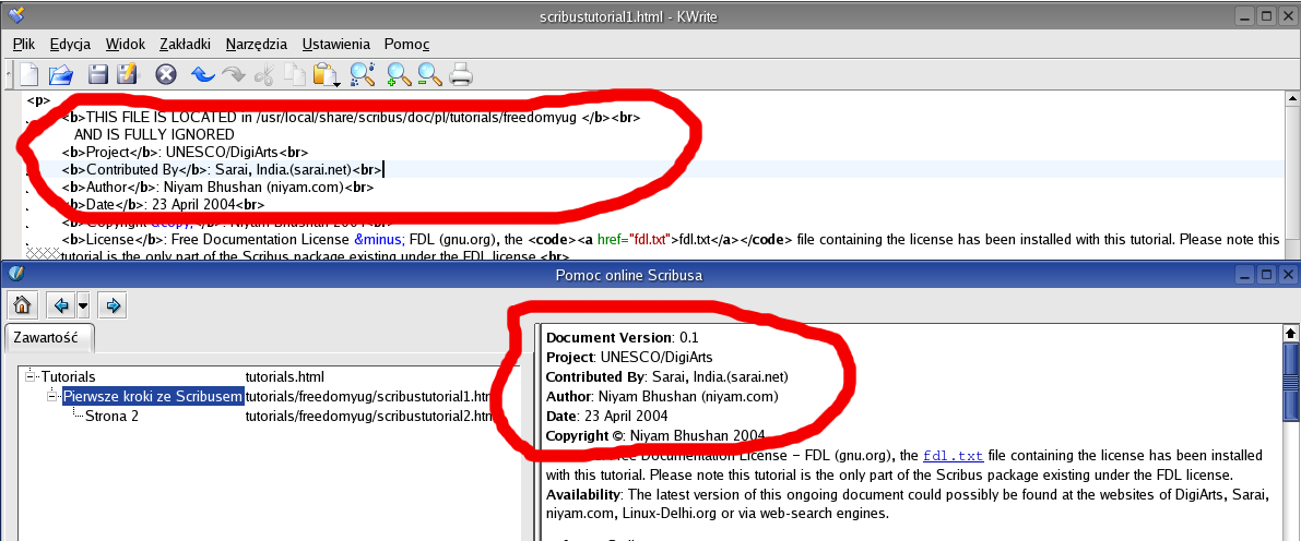 <quote1>3rd party sections can now be added under the tutorial section of help. ie.. in the help browser, tutorial menu. When started it will scan under $prefix/share/scribus/doc/en/tutorials/* and add in any dir in there that has a menu.xml file. An example will come of this with the FreedomYug tutorial.</quote1> <quote2>The help browser uses the GUI language only. It does not allow tutorials to be brought in from dirs other than doc/guiLanguage/tutorials. It requires a basic menu.xml in doc/guiLanguage/ to create the Tutorials menu itself.</quote2> Curious, if symlinks outside of $prefix/share/scribus/doc/pl would be followed. We could combine third party docs for various languages, without having to copy them every time anew into each doc/guiLanguage/ <quote3> It then scans dirs under the doc/guiLanguage/tutorials to see if the contain a menu.xml file for the tutorial itself.</quote3> Just to start with: neither the behaviour described in <quote1> nor that in <quote3> doesn't seem to work for me by now. I've tested it with many combinations and today's CVS and haven't been able to include the Freedomyug tutorial. Perhaps I'm missing something obvious. Scenario 1: Polish GUI language, the installed English documentation will be displayed by default (see screen shot help_browser1.png). Prefix is /usr/local/share, documentation in located in $prefix/share/scribus/doc/en, the Freedomyug tutorial is placed in $prefix/share/scribus/doc/en/tutorials/freedomyug. I've tried to put the accostumed menu.xml into every directory (en, en/tutorial, en/tutorial/freedomyug) without any effect. Scenario2: Switched the GUI language to English and repeated the steps from scenario1. Same results. Scenario3: Copied contents of $prefix/share/scribus/doc/en into new created $prefix/share/scribus/doc/pl and repeated the steps from scenario1 with Polish GUI language - the same results. BTW, if I put menu.xml into $prefix/share/scribus/doc/pl and replace the old menu.xml, there will be only an empty help browser without any contents (screen shot help_browser2.png). BTW, a strange detail, which perhaps deserves a separate bug: I created an empty $prefix/share/scribus/doc/pl directory, the help browser showed no contents. I placed there the menu.xml taken from $prefix/share/scribus/doc/en (beware, no other contents!), and the help browser showed all pages! As far as I can see, menu.xml contains only relative links, it looks like the help browser takes the docs pages from $prefix/share/scribus/doc/en, regardless which GUI language is in use. |