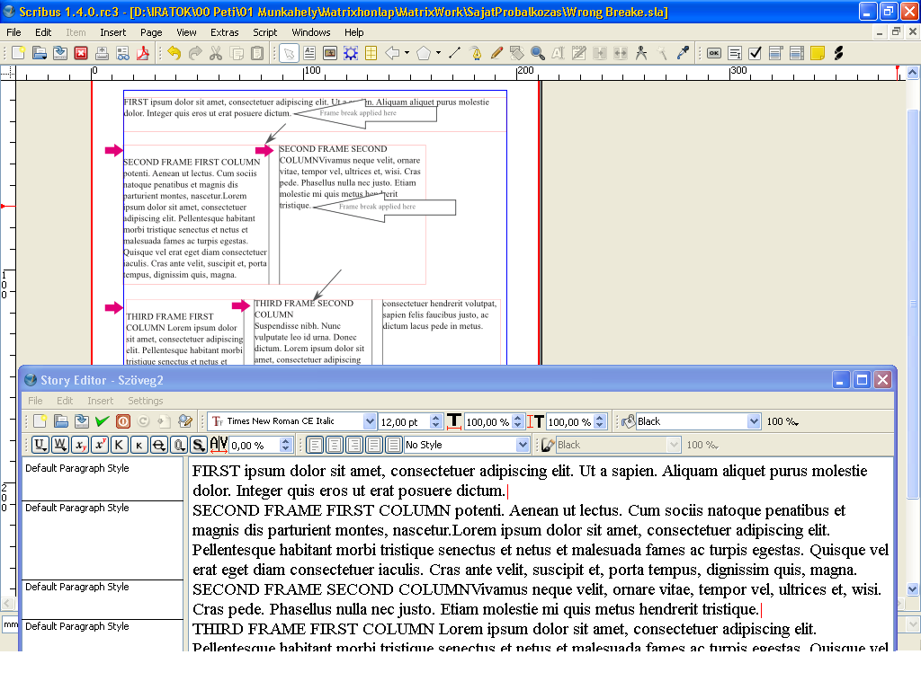 | Steps To Reproduce | Have 2 or more text frames. Text Frame 1: no column Text Frame 2: 2 coulmns Text Frame x: 2 or more columns Link them together. Put text into it (lorem ipsum for example). Use Story Editor >> Insert >> Space >> Frame Break In case You insert the frame break at the end of a paragraph, the new paragraph will have ADDITIONAL 1 BLANK LINE in the document, and can not be aligned with the second column's first line. See pink arrows in the picture. So YOu can apply different styles for each paragraph, but this aokward unalignment will be stay there. | ||||