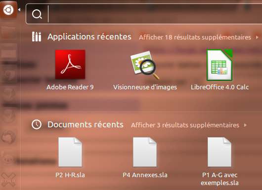 1.5 SLA files now appear in the unity launch proposals window (i dont know the correct names for this, whether its dash or zeitgeist or whatever) so i wonder whether its what this request requests. I upload screenshot. This is a very handy way to open docs. But see other screenshot : the menu appearing on click right on the launcher's icons does not provide any last-opened-files's link. |