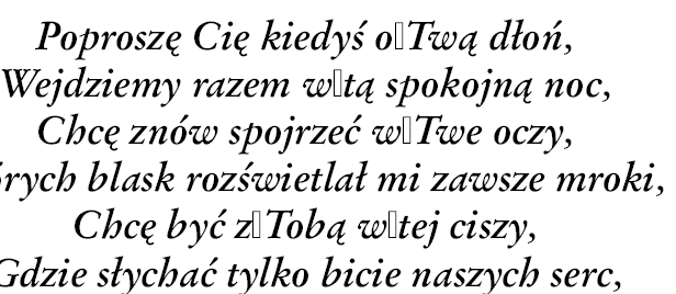 <ITEXT CAB="1" CCOLOR="Black" CSIZE="12" CH="Poproszę Cię kiedyś o Twą dłoń,Wejdziemy razem w tą spokojną noc,Chcę znów spojrzeć w Twe oczy,Których blask rozświetlał mi zawsze mroki,Chcę być z Tobą w tej ciszy,Gdzie słychać tylko bicie naszych serc,To hipnotyczne bum, bum, bum... które mnie kiedyś zaczarowało,Teraz trzymaj mnie mocno za rękę,Biegnijmy wśród ośnieżonych wzgórz zimy,Przez wiosenne pola porośnięte tysiącami kwiatów,Chcę znów słyszeć ten śmiech rozwiewający smutki,Biegnijmy wciąż naprzód razem na spotkanie lata,Gdy spoczniemy na polanie pod lasem,A nad nami wzejdą gwiazdy,I znów nastanie ta cisza, gdy Ty będziesz wpatrzona w gwiazdy na niebie,A ja w tą gwiazdeczkę leżącą obok mnie - w Ciebie..." CSHADE2="100" CSCALE="100" CSHADE="100" CSTYLE="0" CFONT="GaramondNo8 Medium Italic" CEXTRA="0" CSTROKE="Black" />