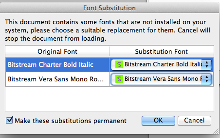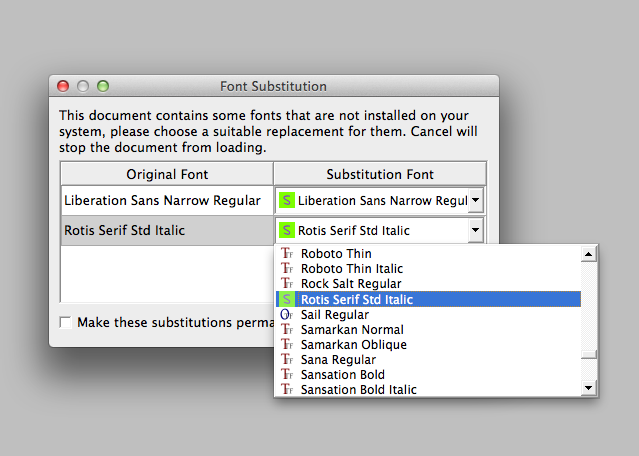 mmm... imo in the substition dialog there should be an option (radio button) "do not substitute" instead of marking the missing font with that funky S... |