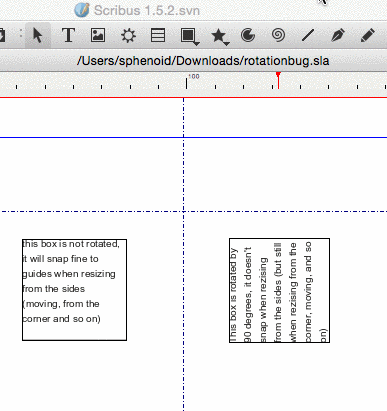 | Steps To Reproduce | 1) Insert a guide 2) Insert an item (example: Text Frame) 3) Rotate the item 90 degrees 4) Try resizing the frame by dragging it's sides (from handles) and get it to snap to the Guide Works if resizing is applied from a corner. | ||||