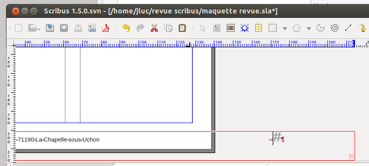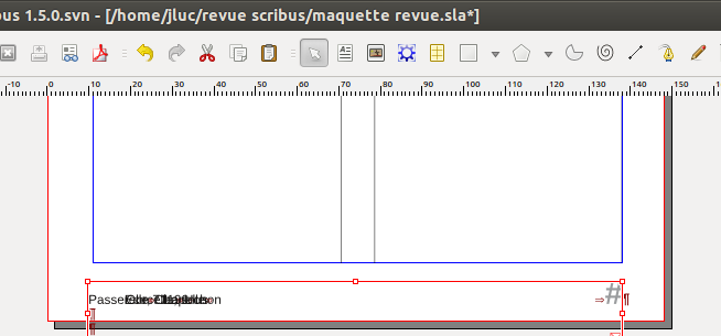 | Description | Same with 1.4.1 and today 1.5svn On a (bottom of page) line i want - say : the name of the magazine, the internet site and the date aligned left on that line, size of font = 8.8 - the pagenumber, aligned at the right. So i create a frame for this line, a dedicated paragraph style, and i set a right-align tab at the right of the frame. I type text, tab, insert page number special character, OK. Now i want the page number to be in a bigger size : 9 is ok, 10 is ok, 11 is not ok at all. left part of the text collapse and print over itself. I try to sort things out. I try to widen the frame : when it is twice as wide as needed, the page number jumps further right, much further than the tab position specifies it. And after doing so, the left part of the text is not collapsed anymore... (but the page number is far right outside of the page!) | ||||