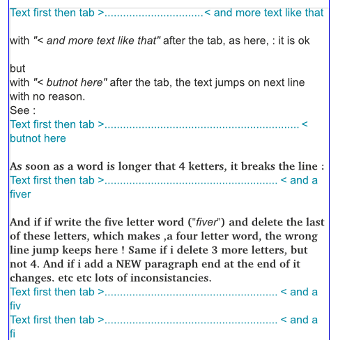 Mr JLuc I assume you understand what tab mean >>>> tab is an expanding blank the right behaviour for it is to shrink according to the content of line or stay in the default size. for example the tab in MVS is 4 spaces by default but it depend on the previous. for example: this is(------tab----------)first line. this is a wrong(--tab--)line this two lines have tab but the tab in the next line is shrinking to organize the text. this is the basic idea of the tab now in our problem the tab have text before and text after. The text after I solved its problem easily but the text before I just have confused because what is happening it shrink the (text before the tab) instead of shrink the tab This happens only when the frame does not fit to the text before the tab and the tab the right behaviour in my opinion is when the text does not fit in the width of the frame its go in next line as any char but I have to ask if this is what the developers need or they want the tab shrinking a little bet and then goes to the next line. that because they want the tab shrinking but instead some thing goes wrong and let the text shrinking I hope I clarify my point completely |