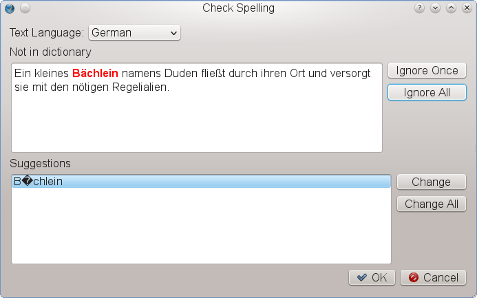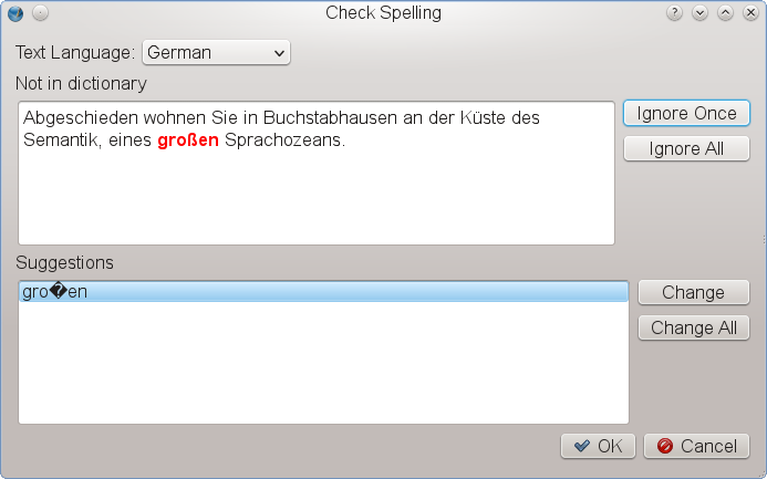| Description | Some correctly spelled words are detected as errors because the new spellchecker plugin (or the library files) don't seem to handle special characters like German umlauts or the ß correctly. See screenshots. | ||||