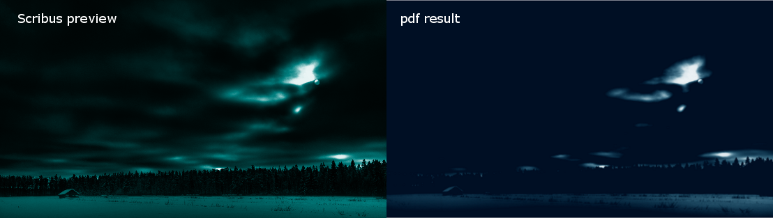 | Description | There is a strange difference between previewed image when duotone effect is aplied, and the image in pdf result. Pdf is still correct (tested on Acrobat) pdf/x-1a but the overall image quality with the effect is non satisfying. in Scribus > looks great in pdf > looks ugly CMS is turned ON, icc profile for PC display used. | ||||