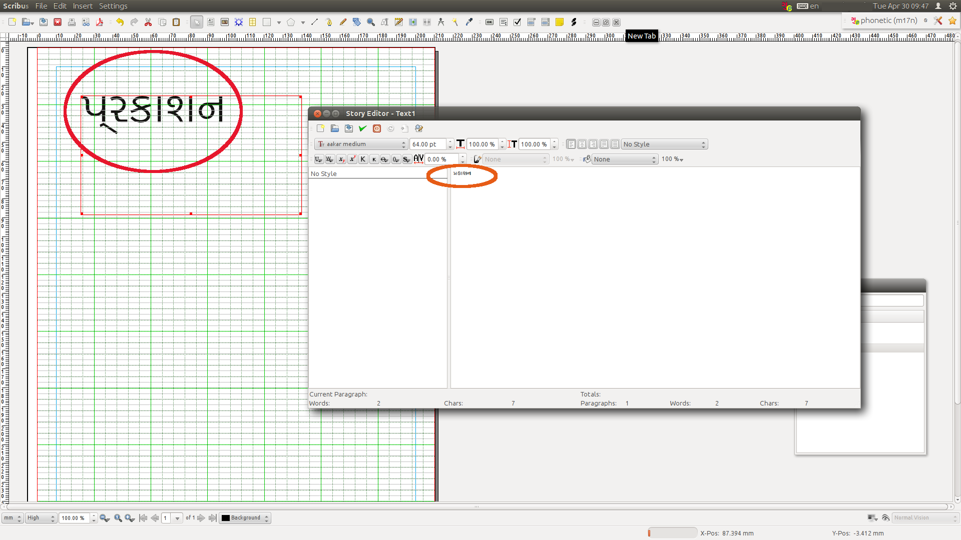 | Description | Gujarati Language doesw not render properly on page inside the frame. In the text editor of the frame, the rendering is correct. See attached screen shot. Orange circle shows correct rendering and red circle shows incorrect one. | ||||