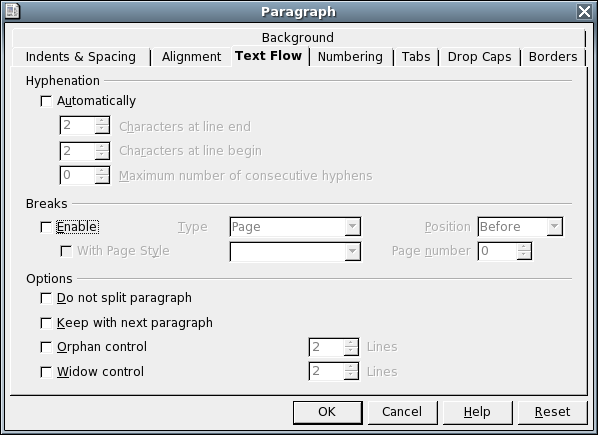 Good idea to place this within the stylesheet context. Perhaps some basic widow/orphan control could be added to this feature, where you can set options like: [ ] Do not split paragraphs [ ] Do not split paragraphs shorter than ___ lines [ ] Orphan control ___ lines [ ] Widow control ___ lines [ ] Remove blank lines from top of column Basically copied this from OpenOffice (screenshot added). Additionally, the option not to break short paragraphs, and to remove blank lines that exist between paragraphs when a text breaks over multiple columns is desirable. |