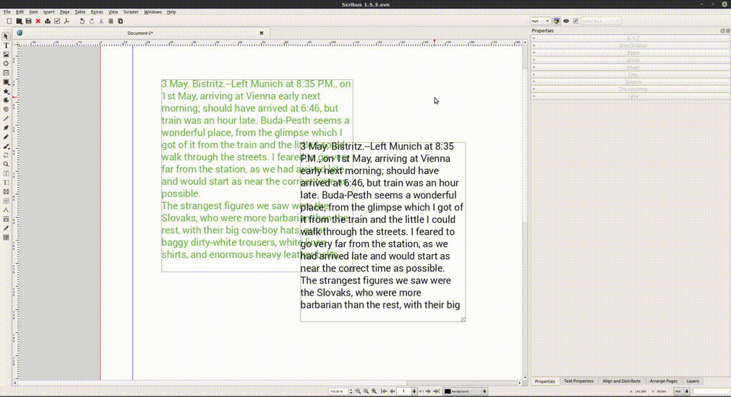 | Steps To Reproduce | - create 2 text frames aside and add big lorem ipsum text to both - select the first frame you created. Check : his level is 1 (z-index=1) - change this frame's flowshape to "frame shape" ('shape' or 'points' pane of the PP, "Forme" in french UI) - bring this level 1 frame over other frame (or rather 'under' it, since level 1 is 'under' level 2 frame) - no flow happens because of levels. That's ok. At this point, level 1 frame is still selected. - using the PP, change his level to "top", that is '2' - see : no flow over it happens. That is the issue since this 'flow around shape' frame is now on top of the other frame. Expected behaviour is : update display so that texts flows around So as to update the display, one solution is to slightly move the frame and bring it back where intended. | ||||