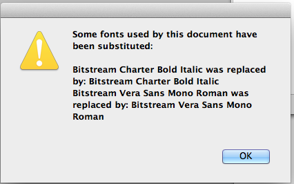 | Steps To Reproduce | 1 Run Scribus 1.4.3 on OSX 10.8.5 (should look for the fonts on-load) 2 Open a Newsletter template Textbased 3 Window prompts for missing fonts Bitstream Charter Bold Italic and Bitstream Vera Sans Mono Roman 4 Upon inspection fonts show to exist and are even marked as so. | ||||