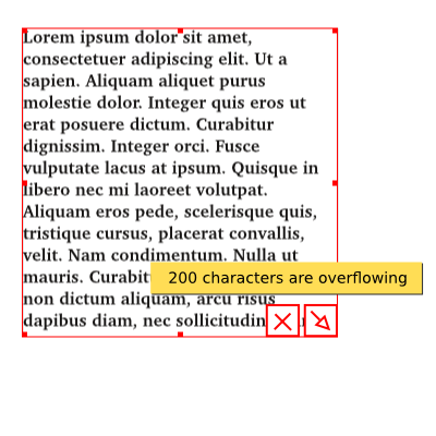 There is something that could be usefully added jghali ; the bubble hint text (appearing on hover) could state : - how many glyphs are left outside the frame (as is now done) - how many NON-BLANK or NON-SPACES glyphs are outside the frame (excluding spaces and line returns and tabs etc). It happens quite often that there is just a couple of linefeeds in the overflow text, and the consequence for the layout work is very different then when there is even only one printing glyph ! So the hint text could become : "200 characters are overflowing (134 non-blank)" |