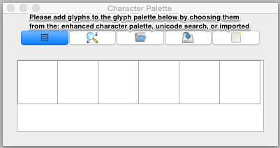 Here is a back-of-a-napkin mockup: Text reads: Please add glyphs to the glyph palette below by choosing them from the: enhanced character palette, unicode search, or by import. |