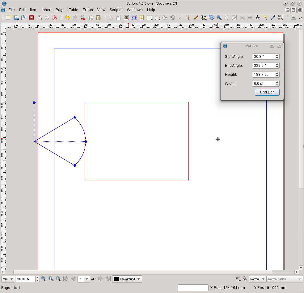| Steps To Reproduce | 0) Create a new document 1) Insert a Arc 2) Double-click on the Arc so that you can edit it 3) Move the handle of the height/width (blue button) over the opposite side of the Frame Result: The Arc will be placed outside of the Frame margins. 4) Close Scribus or close SLA Result: Crash (see backtrace) | ||||