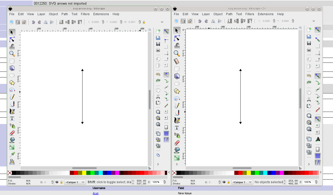 Allways reproduced : Other issue with SVG arrows : open "test arrows.svg" (second uploaded SVG), ungroup SVG, see : most of the arrow heads have rotated or un-rotated and are not in their right place and orientation anymore. After this, try in same document, load "svg arrow.svg" (first uploaded SVG): it has no visible arrows. |