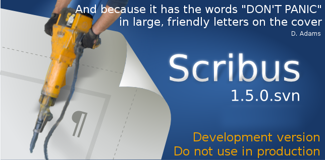 | Description | having nightly DMGs and an homebrew recipe are a good thing! but i fear that some (or many) people will start working with scribus and ignore the fact that they are using a development version (and -- as an example -- write bad reviews or comments related to their experience) so, i'm proposing a specific splashscreen for the dev version... two examples are attached. with or without cultural reference. | ||||
