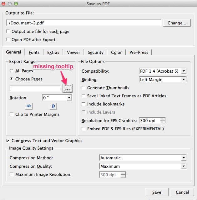 | Summary | 0012507: [PATCH] Added tooltip "Create range of pages" to ellipsis icon in all Scribus export dialogs | ||||