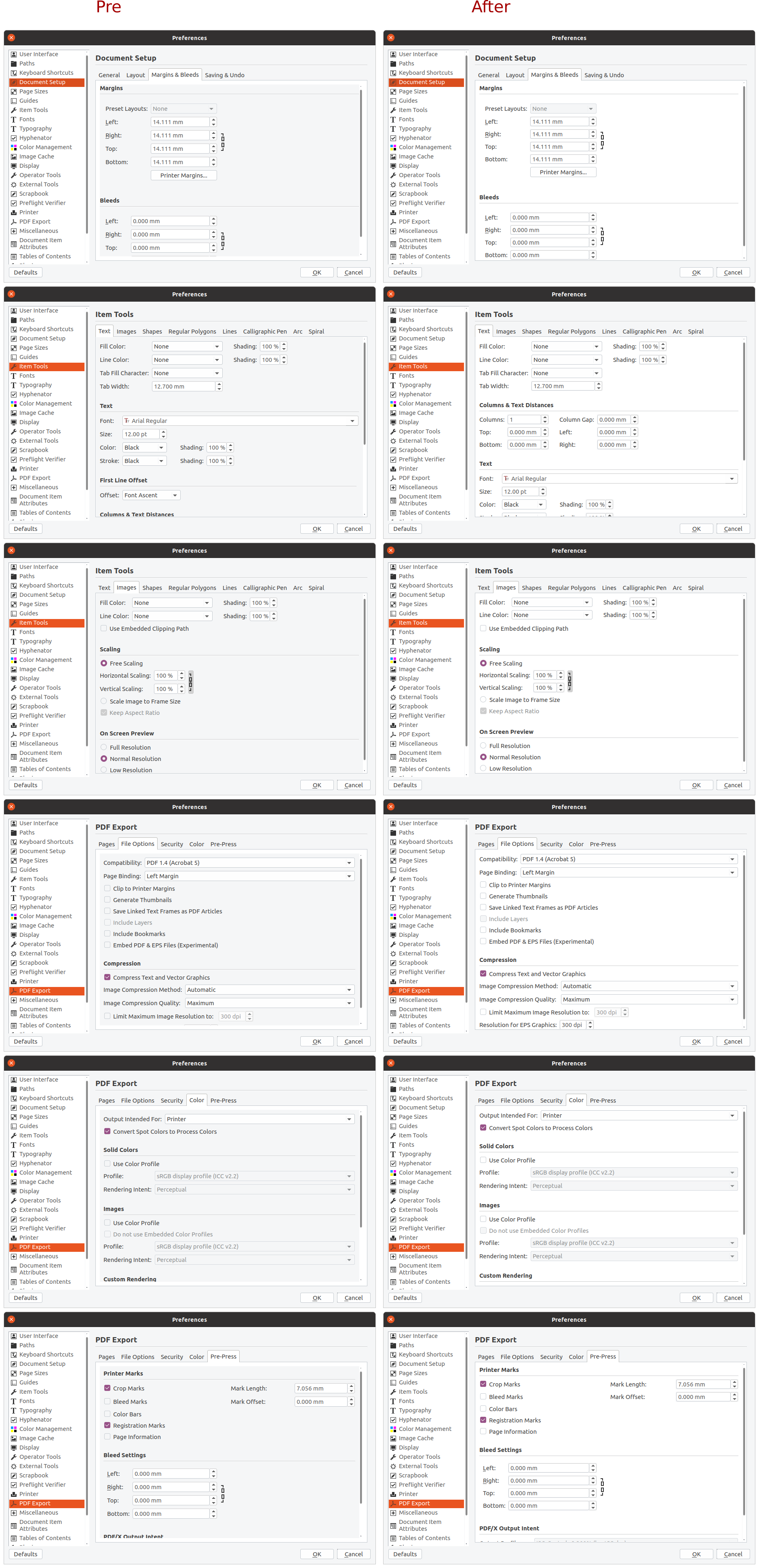 | Description | 1) There are some tabs, where the background colour is not correct. See the attached screenshots. - Preferences > Document Setup > Margins & Bleeds == Document Setup > Document Setup > Margins & Bleeds - Preferences > Item Tools > Images == Document Setup > Item Tools > Images - Preferences > Item Tools > Text == Document Setup > Item Tools > Text - Preferences > PDF Export > Color == Document Setup > PDF Export > Color - Preferences > PDF Export > File Options == Document Setup > PDF Export > File Options - Preferences > PDF Options > Pre-Press == Document Setup > PDF Options > Pre-Press - Preferences > Guides == Document Setup > Guides | ||||