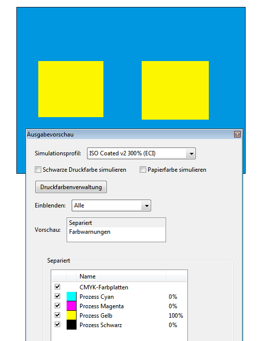 Overprint preview is activated in Reader 8 and Acrobat 8, and other PDF files with overprinting are displayed correctly (same file, not exported by Scribus but printed via FreePDF shows green). So the function is on. And: the Acrobat output preview says the same (only 100% yellow). When I export as PDF 1.3, I get the same error, no green, in both programs. |