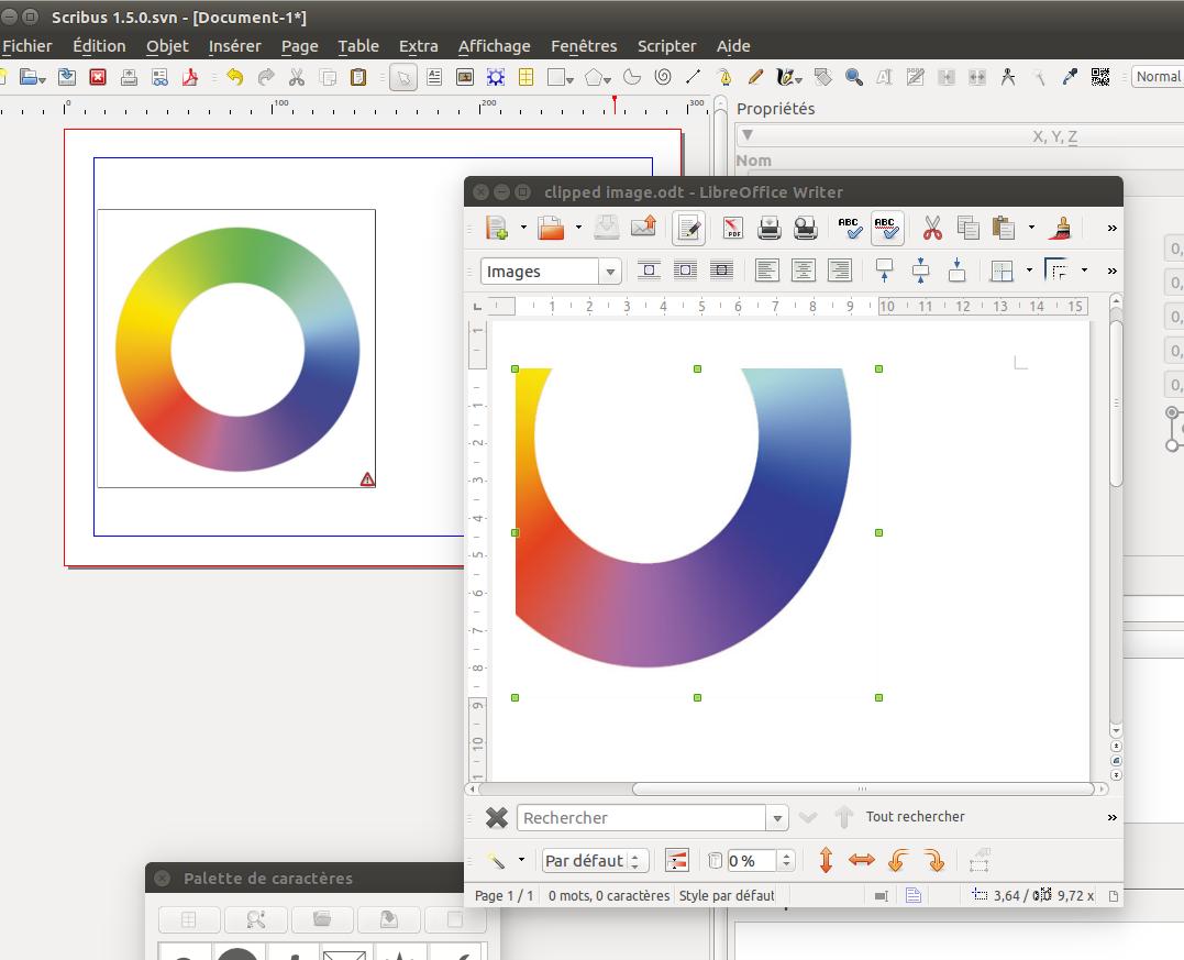 I'm not sure what exactly clipping is because my UI is french languaged. Here is a try file uploaded : a libreoffice file with an image that has been clipped 3cm left and 5cm top using the clip tab of the property dialog (double clic on image opens this dialog) Viewed in libreoffice, its clipped (Well i believe this is what is 'clipped' !) Copied and pasted in Scribus : its not viewed as clipped. Neither the group nor the image itself have a different 'contour' property. Where is the clipping path ? |