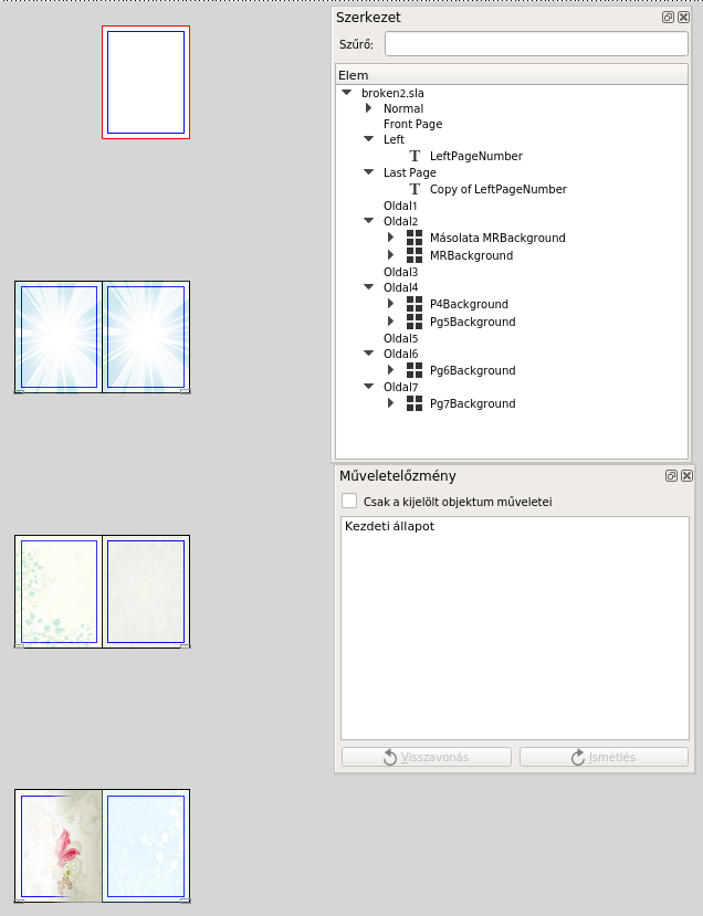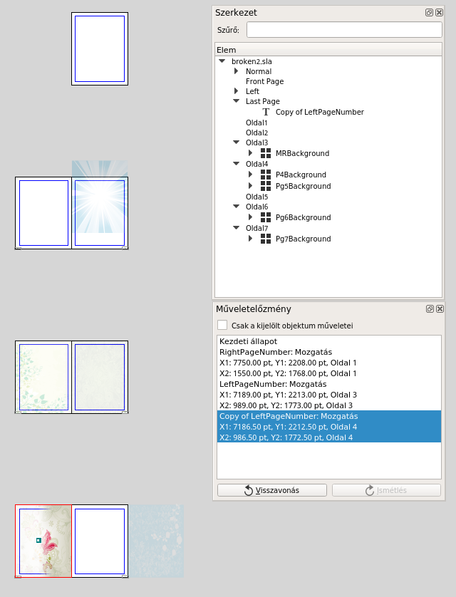 Peter, Can you do another screenshot that also includes the outline menu The issues is that Scribus here is for some reason saving the background images that should be on separate pages, all on one page (see my screenshot for pages 4 & 5). It also is saving the position of background images way off the side of the intended page (see page 7 in my screenshot). Unfortunately, I do not know how to reproduce this. |