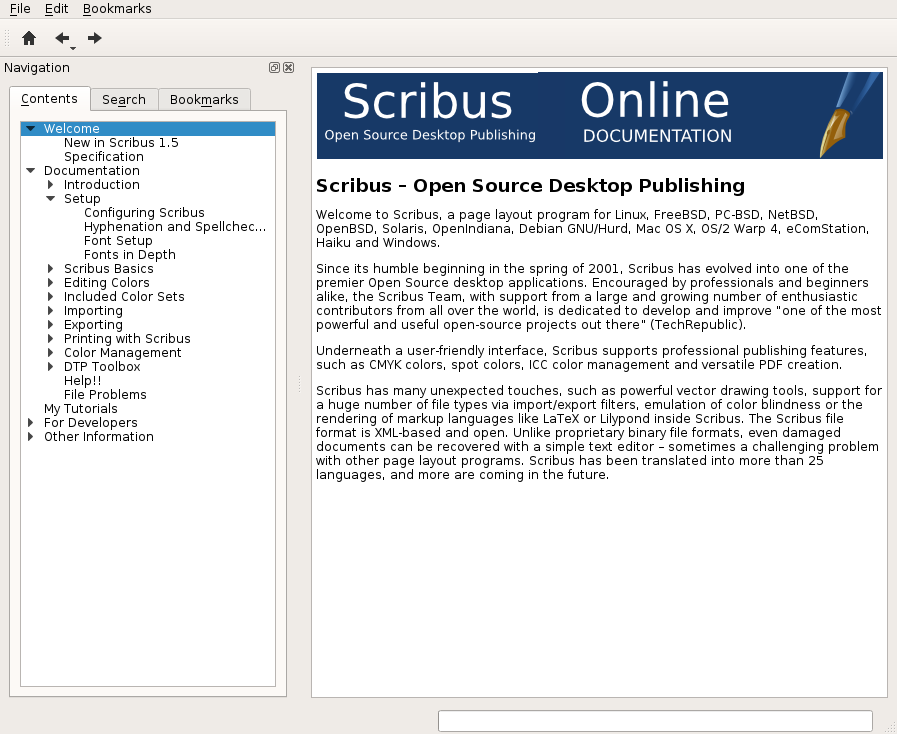 Thanks for the quick reply! According to http://doc.qt.io/qt-4.8/qthelp-framework.html#using-qhelpengine-api the QtHelp system relies on QTextBrowser (if QtWebKit is not built). Maybe using QTextBrowser instead of QtWebKit is a viable solution for Scribus as well? |