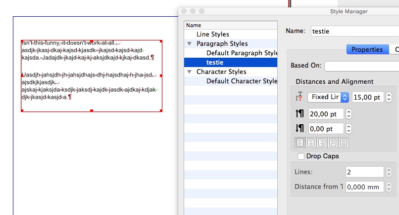 | Steps To Reproduce | Create new document Create text box Create some text (2 paragraphs) Open Styles editor Create new Paragraph Style Assign a 'Space Above' (i.e. 20pt) Apply style to both paragraphs Observe that only 2nd paragraph gets the 'space above' | ||||