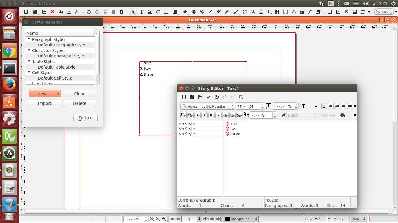 various answers : - marks update has allready been recently improved in http://scribus.net/websvn/listing.php?repname=Scribus&sc=1&rev=20528 Are you sure its required to add a one more call to updateMark ? - as for updating numbered lists, it seems improved, but it still takes several/some sort of actions for a numbered list to get updated after deleting a line. Dont you meet that behaviour ? - as for ? : testing the numbered list feature shows that it appears in the canvas display when scribus first creates a new numbered paragraph inside an existing list. I'm not sure why it's not displayed immediately as a number. That can/should possibly be improved. - I guess the @ is used for the story editor view ? - I dont think "Default Paragraph Style" is the same as "no Style", execpt when your frame has a default paragraph style set to "Default Paragraph Style"; but how is this related to this issue ? |
