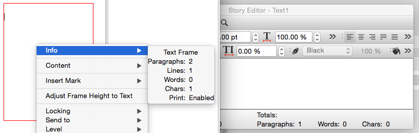 | Description | Inconsistent counting of Text Frame content in Info/Story Editor. | ||||