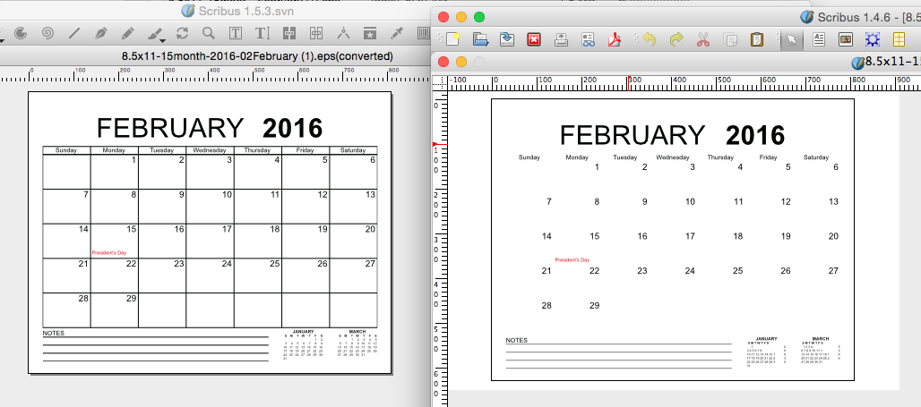 1.4.5 I confirm the missing grid lines for the Calendar But I can't reproduce OP's When I imported the graphics the small calendar months (prior and future month) that appear in the bottom right hand corner of the calendar page did not import properly. The numbers that represent the days are all bunched up to the left Everything looks good in 1.5.0 MacOSX 10.10.5 |