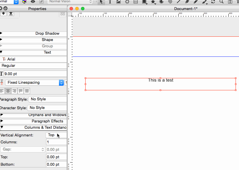 Good question -- it's not easy to get to that point. 1. select the text box. 2. select characters of text within the text box, this will cause the Properties menus to change. 3. Once some text is selected, then the menu "Columns & Text Distances" will appear. 4. The first pick list under "Columns & Text Distances" is "Vertical Alignment"; there are three choices: a) Top, b) Middle, and c) Bottom |