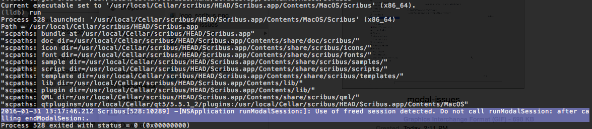 | Description | 2016-01-31 13:17:46.212 Scribus[528:10289] -[NSApplication runModalSession:]: Use of freed session detected. Do not call runModalSession: after calling endModalSesion:. Attached gif | ||||