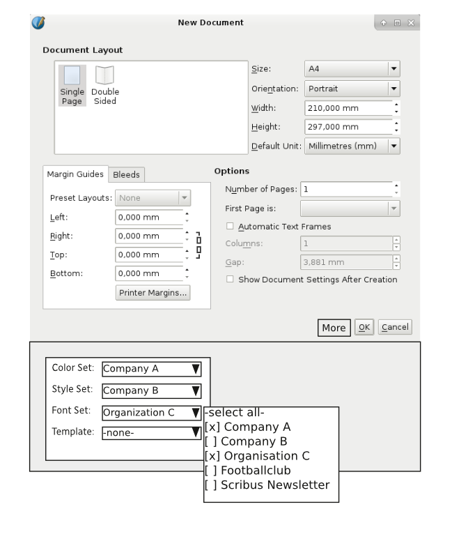 That's the reason for the more button - if nothing is selected, Scribus does the same as now. But a document style with fonts, colors, styles would be ok too. (It's not the same as template because of i.e. different page size or adding a new textframe will still show the whole fonts list...) Rgds |
