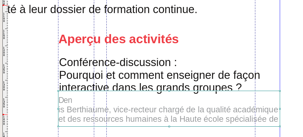 | Description | With this attached sample https://bugs.scribus.net/file_download.php?file_id=8427&type=bug from bug 0013892 you will see (presuming that you have the "Liberation Sans" fonts installed) that the gray text below the main text under the "Aperçu des activités" header wraps strangely... instead of showing up like this: Denis Berthiaume, vice-recteur chargé de la qualité académique et des ressources humaines à la Haute école spécialisée de Suisse occidentale. ...it will show up as: Den is Berthiaume, vice-recteur chargé de la qualité académique et des ressources humaines à la Haute école spécialisée de [x] | ||||
