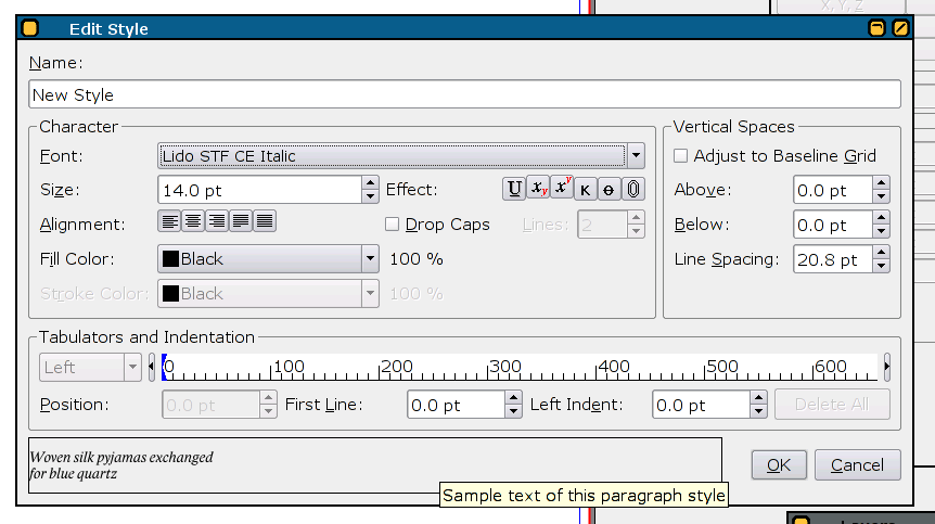 | Description | If you edit or add a style you don't see how the style looks like. You need to apply the style first. Please add a example-text at the bottom of the editor with the current fontsetting of the style. If the use changes eg. the size apply this change to the example-text. | ||||
