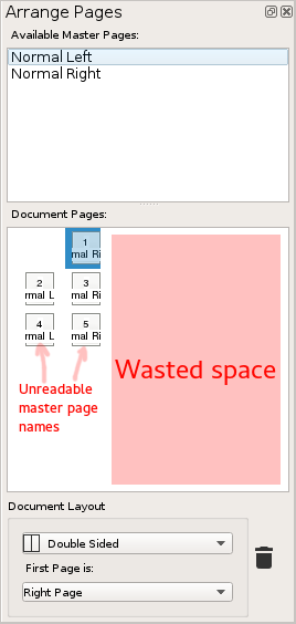 | Description | The current layout wastes a tremendous amount of space while simultaneously making it impossible to read the name of the master pages applied to the various pages (see attached screenshot). For the longest time I thought this felt broken, like some sort of alignment bug, but I see it's still present in 1.5.x so I'm reporting it and offering a UI suggestion for it. Since scribus only ever deals with single or dual-page documents, and there is always a certain amount of white space due to the width of the "Arrange pages" window/pane, we can leverage this space. My suggestion is to center the page icons, reduce their gutter (as you'll see in my mockup, they are actually closer together, horizontally speaking) and put the applied master pages' names on the side of each page (a compromise could be made between this and the current approach: the names labels could start "in" the pages icons and then extend outwards to the left or right, to have fit longer master pages names). Will attach a mockup to illustrate this. | ||||