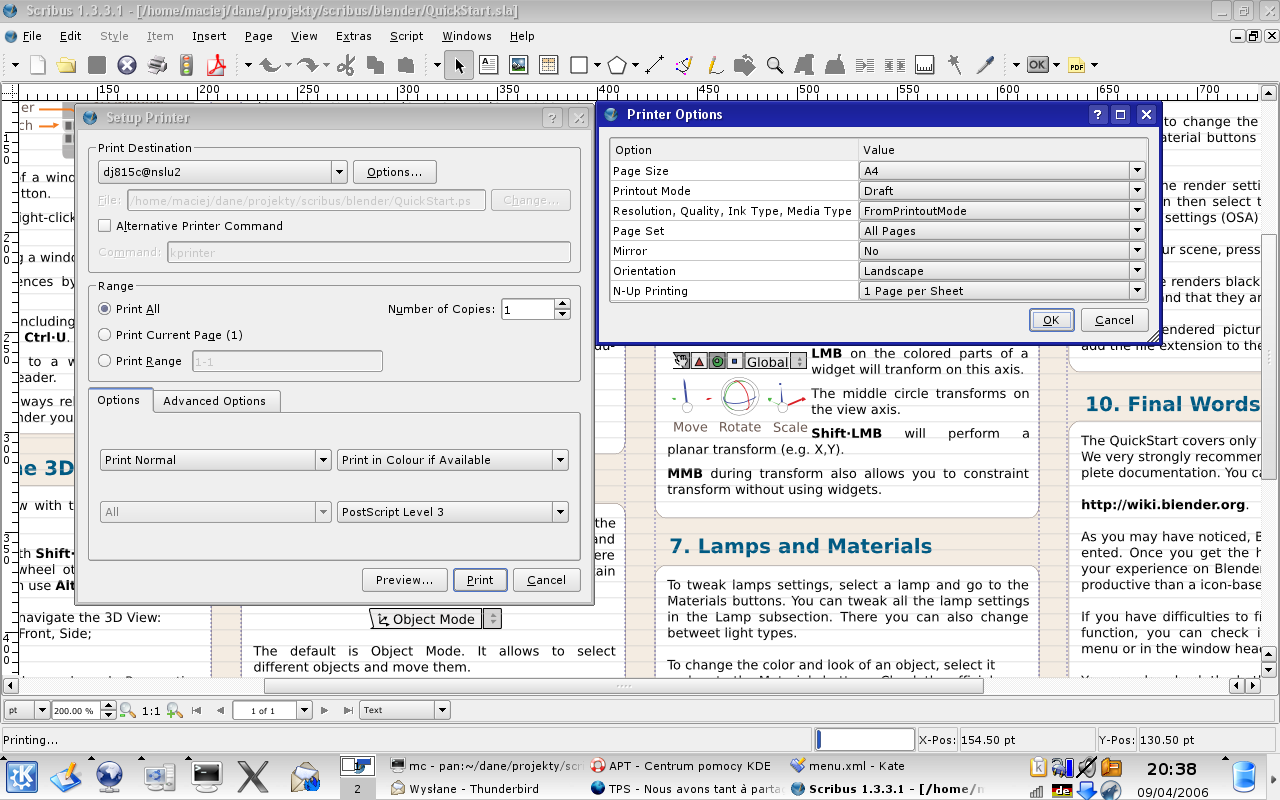 Reminder sent to: christoph_s, louisdesjardins, PLucAuclair could you try to print in landscape the abovementioned Blender Quicks Start Guide from Scribus 1.3.3.1 and see, if you encounter any troubles? |
