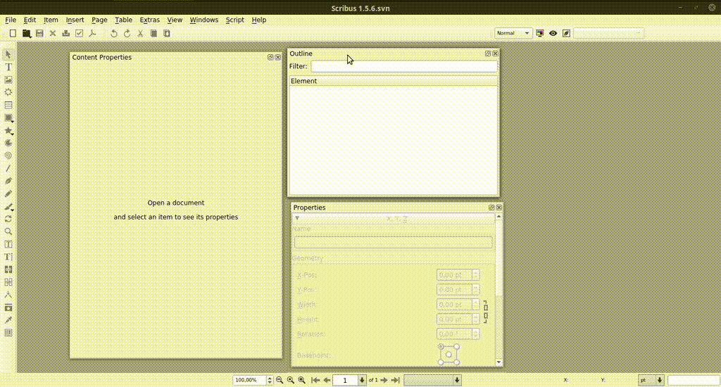 I can still reproduce in Scribus 1.5.6svn and LinuxMint 20. I use Scribus appimage from http://impagina.org/download. " I did the tests again. I can't reproduce the original question, but in one case the scribus still does not work properly. -- Unpin all windows in Scribus window -- Close all Windows in Scribus (Properties, Content Properties, Action History etc.) -- Open Properties, Content Properties, Outline -- Pin the Properties and Content Properties -- Close Content properties Now... -- Pin Outline above the Properties window -- Click: Windows menu -- Contet Properties Result: Disappear the "full screen" scribus window controller and the scribus window will be larger than the vertical size of the screen. " |