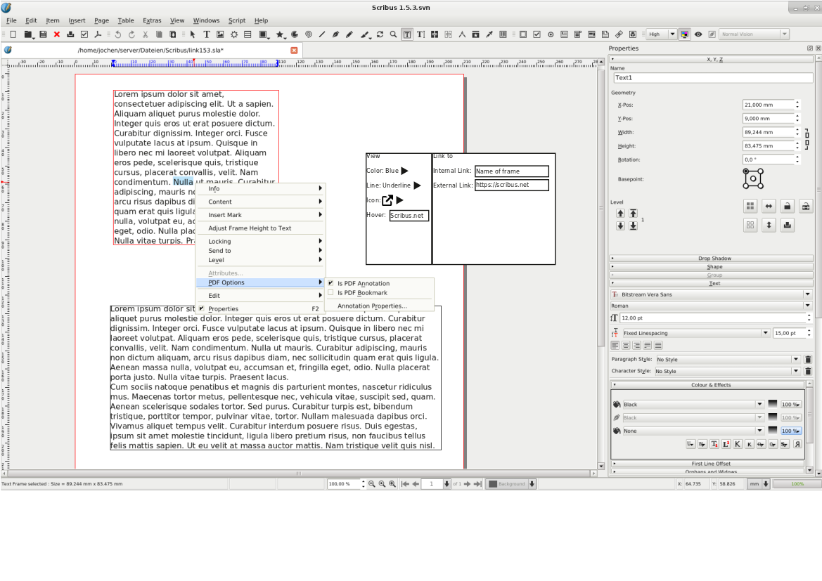 Just a suggestion^^ The GUI isn't very important in this request (or idea). PP is ok, why not. Keeps the desktop clean. The main problem now is that you have to make the links as the last step of the document (and that it's real hard to place the "link frames" and the destination right). If you for example add text in front of the link frame, this frame ain't correct anymore. Same when you move the link destination for example to the 2nd page - the link still says 1st side X = mm, Y = mm. I thought of the link frame somehow like background color of text (not frame). This bg-color moves when you add text. Should be possible? And the destination is for example the text frame "foobar 1" - no matter where in the document this is. Hover is already possible somehow, but I didn't find out yet how to add it to a link. That's very confusing with text and enable js and geturl... Should be possible to make this easier and also for internal links? Symbols for internal and external links are state of the art. A little collection that can be extended shouldn't be too difficult? (Or no symbol of course^^) |