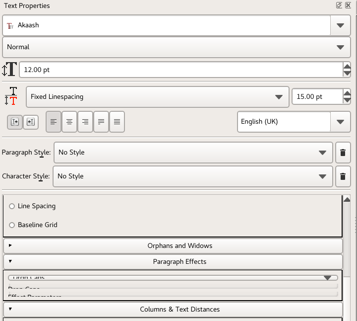 | Steps To Reproduce | 0) Create a new document 1) Insert a Text Frame 2) Open: Windows > Text Properties 3) Open a few tabs except Pragraph Effects to fill the height of the screen 4) Select a Paragraph Effect The widget is very small and text is not visible. | ||||