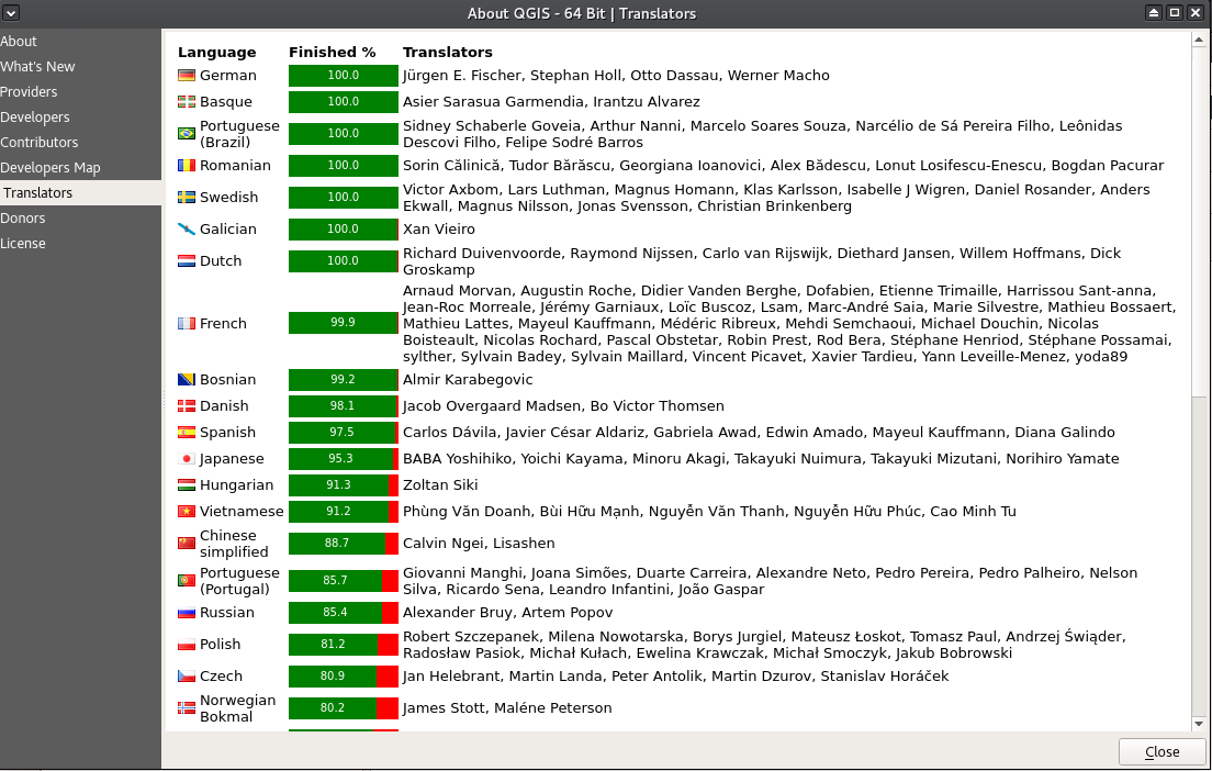 | Additional Information | Links: The page they pull in to About: https://github.com/qgis/QGIS/blob/master/doc/TRANSLATORS https://github.com/qgis/QGIS/blob/master/src/app/qgsabout.cpp#L185-L205 https://github.com/qgis/QGIS/blob/master/src/ui/qgsabout.ui https://github.com/qgis/QGIS/blob/master/src/app/qgsabout.h | ||||