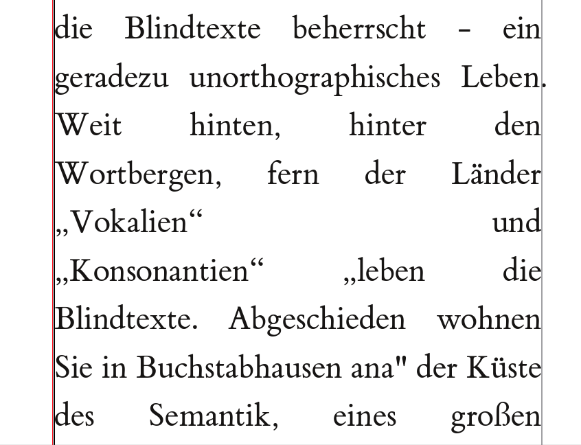 | Description | ERROR: Optical Margins (German: Optischer Randausgleich) also known as "hanging punctuation" does not work at all on leftside quotation marks. FEATURE REQUEST: Also, it would be nice, to have an option to choose, if a punctuation sign should be completely shifted to the side. So that the text is aligned, as if there was no quotation mark, and after the sign will just take place, next to the line (both, left and right – or again as chosen by the user). RELATED ERRORS: The following may be an error on his own, but it's somehow related, because I think the "Optical Margin" function should handle this, before the line breaks: At some point the justified text breaks and creates huge holes instead of shrinking holes that have already been quite big (See the pictures). Yet another error: What is the purpose of the "reset button" in the Optical Margins menu? As it does not change the look or the selected option for me. | ||||