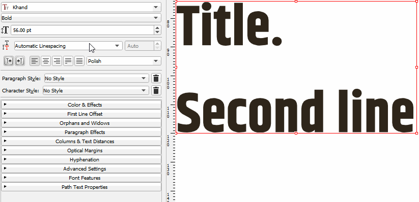 | Description | I'm not sure if it's Scribus bug or font issue, but take a look @ gif. Font used: Khand. With automatic line spacing all is fine, but can't adjust line spacing ;) | ||||