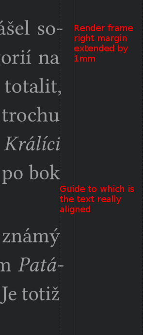 | Description | I use LuaLaTeX in redner frames to typeset paragraphs of running text for book covers, because of superior results of Knuth-Plass plus microtype. As I enable protrusion in microtype, there are some characters slightly sticking out of the frame which get CLIPPED in scribus. This is unlike text frames, where protruding characters do stick out of the frame shape without getting clipped. This issue is a request to (optionally) allow in the placed PDF for material sticking out of the render frame body (of course, it does not make sense for raster-image frames like POV-Ray). My current workaround is to place the render frame 1mm off the guide (which is rather inconvenient) and add 1mm margin to the LaTeX page, e.g. this would be for a colum of width 111mm: \usepackage[margin=1mm,papersize={113mm,150mm}]{geometry} % leave 1mm for protrusion The result is perfect but the frame outline is not aligned. A screenshot is attached. | ||||