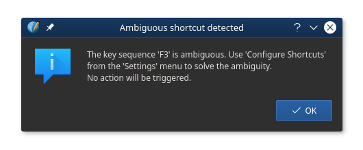 | Description | The F3 shortcut is by default assigned to both Styles and Text Properties, thus pressing F3 result in error message (The key sequence 'F3' is ambiguous. Use 'Configure Shortcuts' from the 'Settings' meny to solve the ambiguity. No action will be triggered. While this is easy to fix, it should not be this way by default (I am not aware that I changed this myself). | ||||