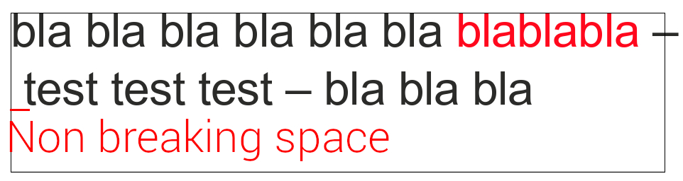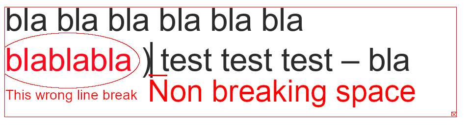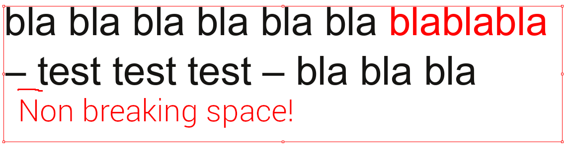 | Description | Tested r22187 Comment: A few days ago this worked well. -- Open the Doc-1.sla -- Look it: "blablabla – test" the "– t" between is "Non breaking space" (incorrect_break.jpg). The Scribus does not detect this. But Scribus doesn't work well with another characters. Example: ")", "." ,"/" etc.) (another_character_1.jpg) I examined in the Scribus 1.5.3. Result: Works well (correct_break.jpg)! | ||||