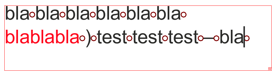 The last well-functioning version: r22163 The r22167 already contains the bug. "But Scribus doesn't work well with another characters. Example: ")", "." ,"/" etc.) (another_character_1.jpg)" These characters are still causing a broken line break, in r22163 too. Perhaps related: 0014999 ? I don't know... |