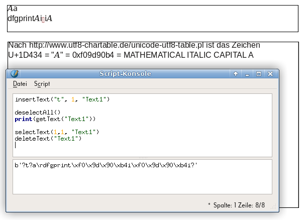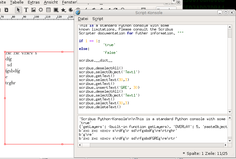 | Additional Information | Additional Information as was present on the mailing list thread "[scribus] Scribus 1.5.3 on Debian with Python 3" (e. g. Wed, 25 Oct 2017 08:54:06 +0200) How to use: Enter some python code in the console and it get's executed. (This is the proof-of-concept for Python 3 running with Scribus). The function is illustrated on http://jbechtel.de/dist/scribus-py3 (or see the bugtracker attachments.) * It doesn't work with the pdf export functions. I did not test / do not remember at which invokation stage the pdf export stucks * There may be many errors in the string exchange between Python / User / Scribus Text Frames (because you have to differentiate between strings with code points and strings computed byte-by-byte -> the different parts of the program may count the chars differently, which makes text editing harder.) * I did not test any window or so which is opened by the script as user interface. * It doesn't work to load an external script invoked from GUI/Menu bar. (Displays an error but no error text) * But you can load an external script from Scripter Console: # https://stackoverflow.com/questions/1027714/ -> https://stackoverflow.com/a/31566843 vars = globals(); exec(open("test2.script").read(), vars) print (vars) # This doesn't forward the output of test2.script, but the script's execution leads to the desired effect on the document. | ||||