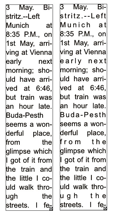 DescriptionThis is feature from Quark. When column is really narrow and there is one or two words in one line tracking is extended to fill whole line. I've attached manually-made exaggerated example from Scribus.