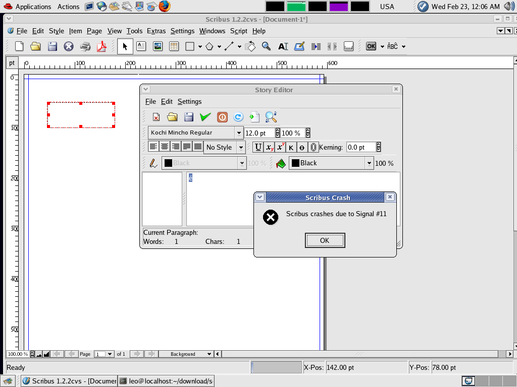 | Steps To Reproduce | 1. Launch Scribus 2. Create a new document 3. Create a text form 4. Open the Story Editor. 5. Enter a "composite" french character (like the very common "e circumflex" that appears in many french words) 6. Try to "update" the document : nothing appears on the screen (although the "e circumflex" appears in the Story Editor). 7. Select, in the Story Editor, the "composite" character. Instant crash. | ||||